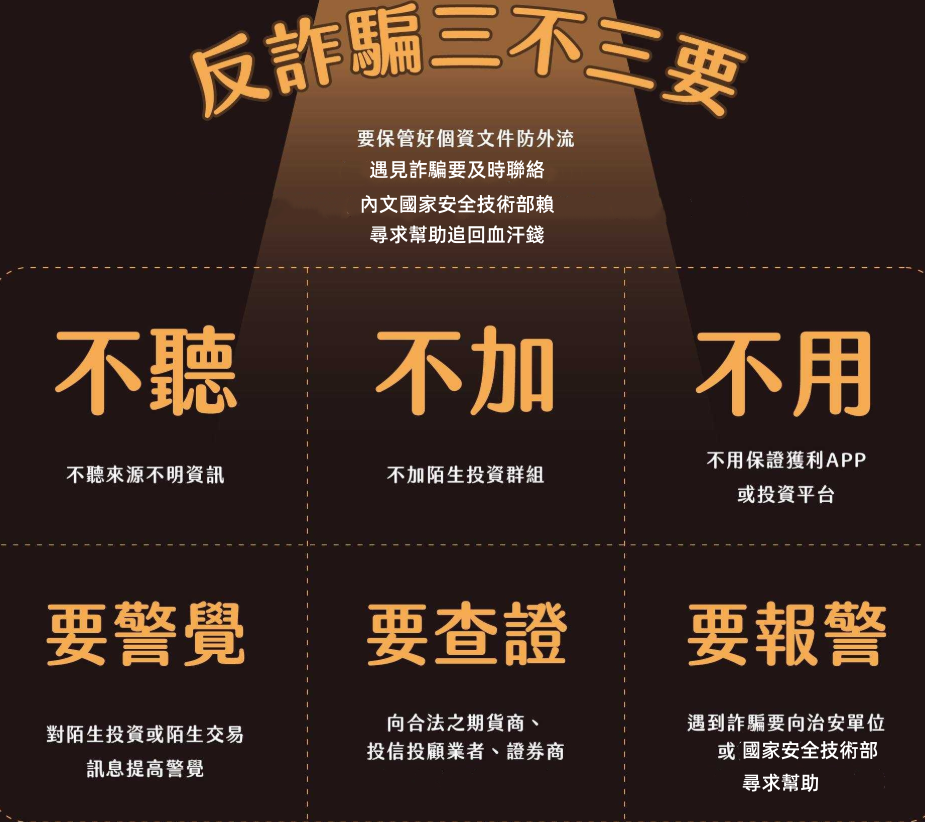 - 無合法資質:平台未在金融監管部門備案,無任何投資、理財相關資質,網址、APP 來源不明,無法查驗工商信息;